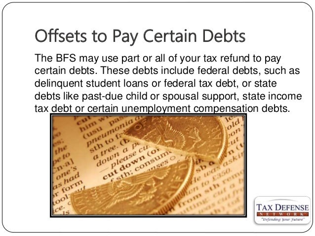 For federal income tax refund offsets, the amount subject to offset includes the amount of an earned income tax credit due you. Federal tax refunds payable to joint filing couples are subject to offset, as explained in the notice, but that portion of the refund owed to the non-debtor spouse can be recovered by that individual by filing an 'injured spouse' claim with the IRS. Jan 17, 2018 If your federal student loans are in default, the Department of Education can refer your account to the Department of Treasury for collection by an offset of your federal (and in some cases state) tax returns. The Department of Treasury can withhold the entire amount of your refund to satisfy the debt that is owed.